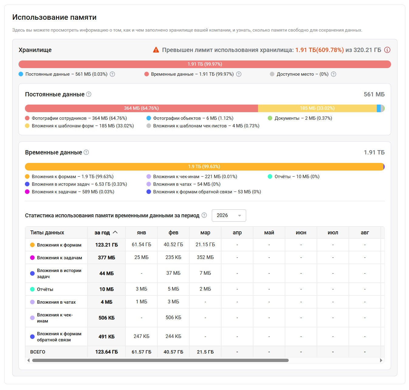 Общий объём памяти — это объём хранилища, который используется для хранения данных вашей компании на текущий момент. Если используемая память превышает доступный лимит, дополнительный объём оплачивается отдельно в соответствии с тарифами.