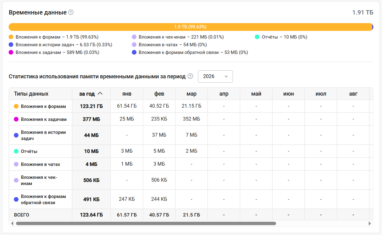 Временные данные — это данные, которые создаются при работе системы, пользователей и ваших сотрудников и хранятся в памяти только определённый срок согласно тарифам. Получить доступ к этим данным по истечении срока их хранения невозможно.