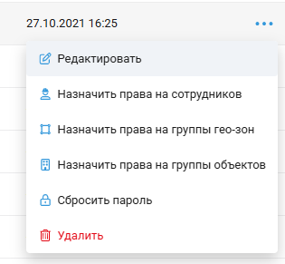 - Просмотр: доступ на просмотр и редактирование сотрудника, возможность просматривать историю его перемещений, настраивать автоматические отчеты, назначать сотруднику задачи, закреплять за ним объекты.