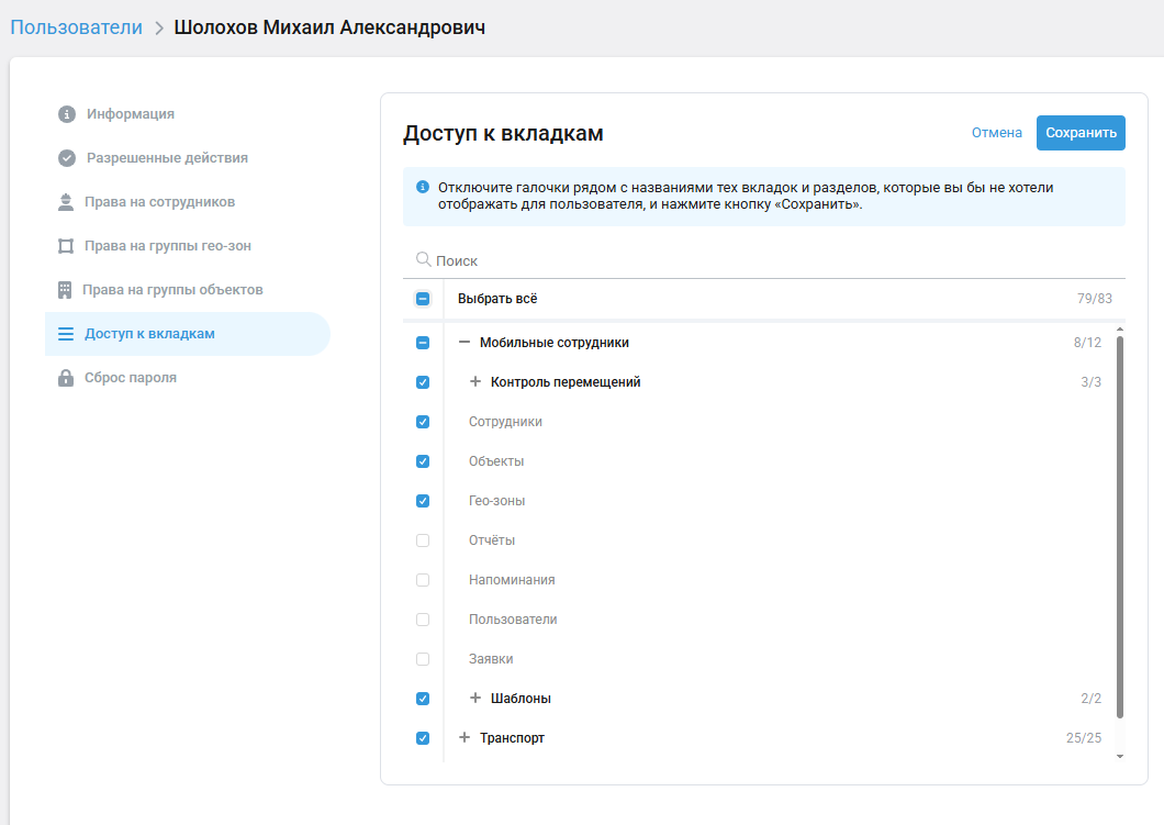 Права доступа пользователя — это разрешение выполнять те или иные действия в услуге. Пользователю можно настроить права на действия с сотрудниками, объектами, геозонами.