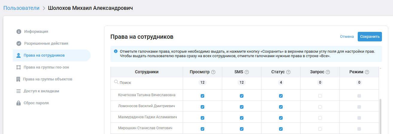 Чтобы выдать пользователю права сразу на всех сотрудников, отметьте галочками нужные права в строке «Все».