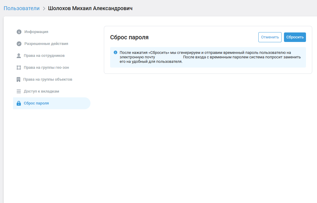 После нажатия «Сбросить» мы сгенерируем и отправим временный пароль на электронную почту пользователя. После входа с временным паролем система попросит заменить его на удобный для пользователя.