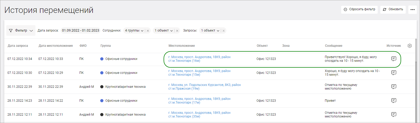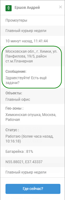 Текст сообщения и местоположение также отображаются в окне информации о сотруднике в разделах Где сейчас и Карта перемещений. Для этого нажмите на имя сотрудника в списке или на его иконку на карте.