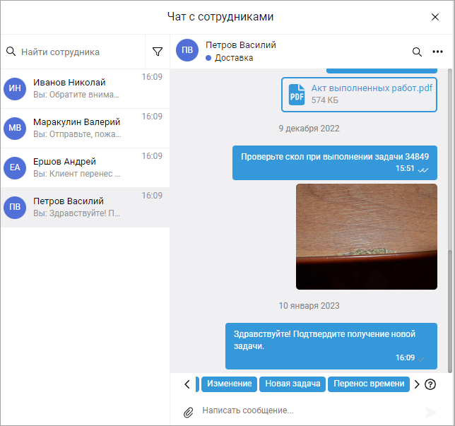Вы можете обмениваться с сотрудниками сообщениями в удобном чате, уточнять нужную информацию, отправлять необходимые документы.