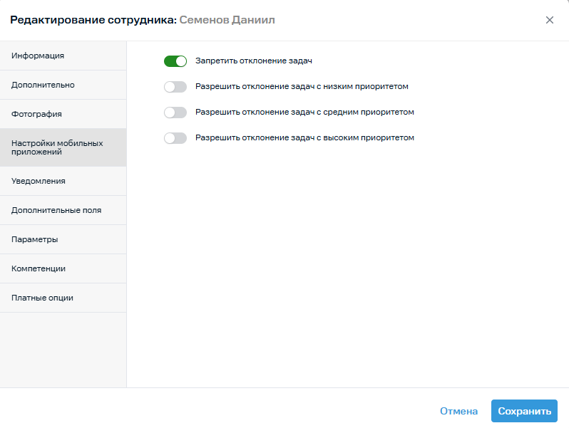 5. Во вкладке Настройки мобильных приложений вы можете запретить отклонение задач, а также разрешить отклонять задачи с определенным приоритетом.