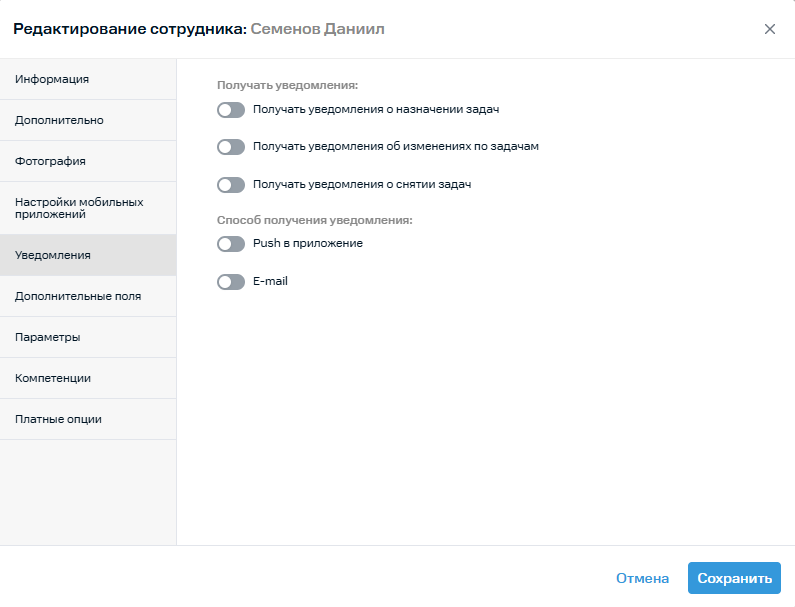 6. Во вкладке Уведомления вы можете настроить, какие уведомления по задачам будет получать сотрудник на электронную почту и в push-уведомлениях в приложении.