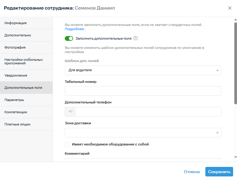 7. Во вкладке Дополнительные поля вы можете выбрать шаблон дополнительных полей и заполнить их.