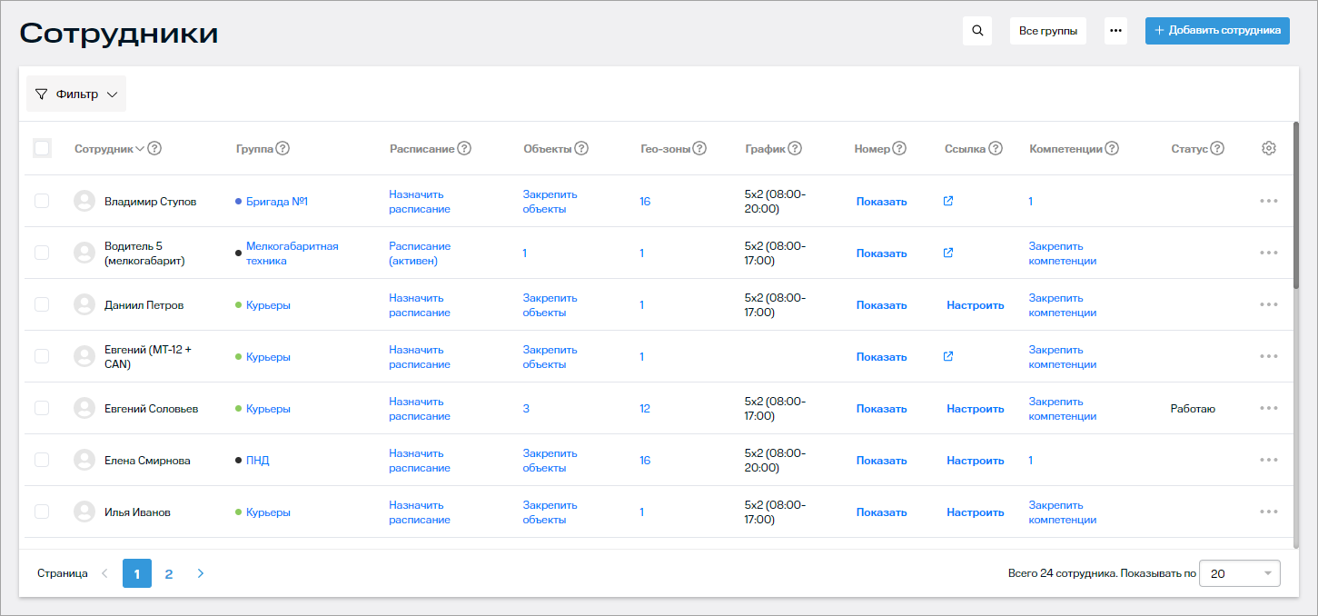 - Группа — группа, к которой принадлежит сотрудник (например, «Курьеры»);