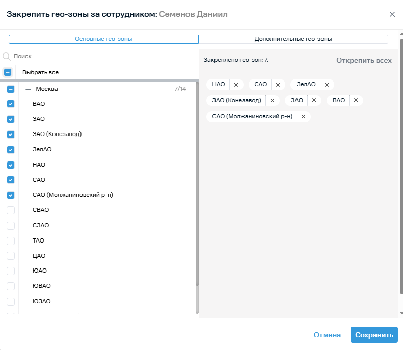 Одна гео-зона может быть закреплена за сотрудником либо как основная, либо как дополнительная.