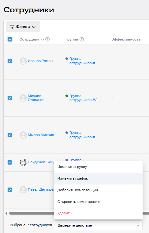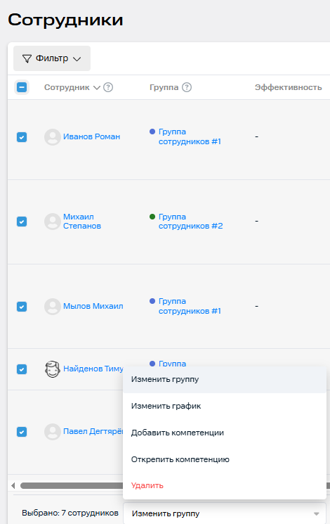 Чтобы изменить сразу несколько сотрудников: