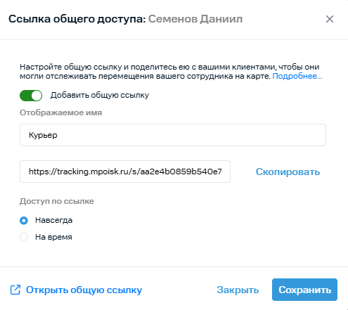 Общая ссылка пригодится, если нужно, чтобы клиенты могли самостоятельно отслеживать перемещение ваших сотрудников на карте. При этом им не требуется логин и пароль от услуги, а местоположение сотрудника показывается примерно.