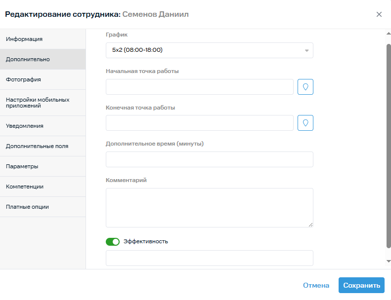 На вкладке Сотрудники вы можете отредактировать сведения о сотрудниках, назначить или изменить группу, к которой они относятся, расписание запросов местоположения, прикрепить новые объекты или изменить список уже прикрепленных к сотруднику объектов.
