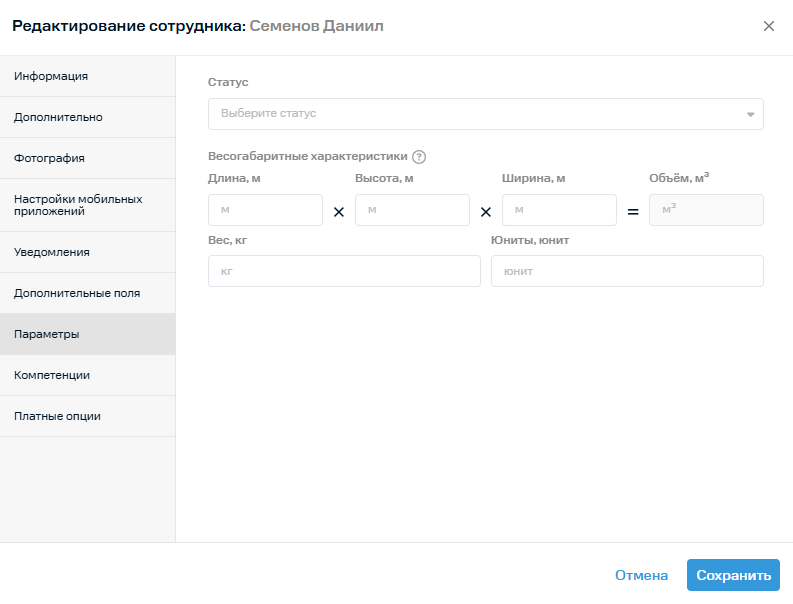 - Весогабаритные характеристики (длина, высота, ширина, объём, вес, количество юнитов). Данные о габаритах будет учитывать автодиспетчер при распределении задач. Например, у сотрудника должно быть достаточно места в машине, чтобы ему была назначена задача на доставку холодильника.