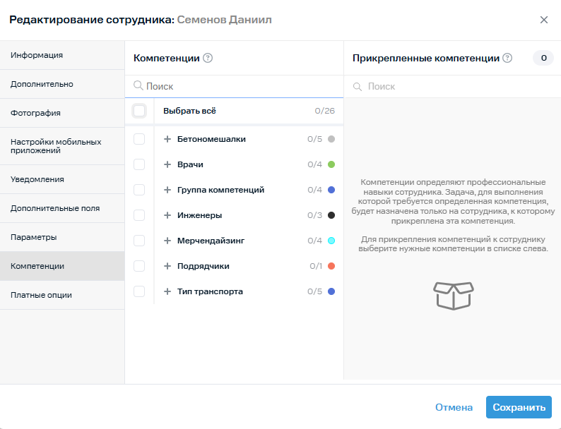9. Во вкладке Компетенции вы можете закрепить компетенции сотрудника. Компетенции определяют профессиональные навыки сотрудника. Задача, для выполнения которой требуется определенная компетенция, будет назначена только на сотрудника, к которому прикреплена эта компетенция.