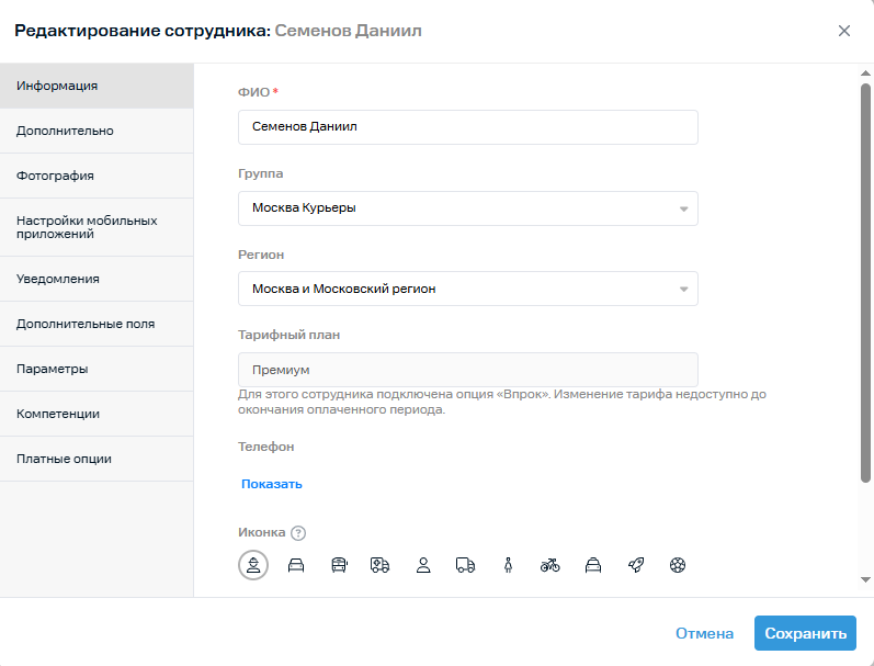 Тарифный план нельзя изменить, если для сотрудника подключена опция «Мобильные сотрудники впрок» и до окончания ее действия осталось больше 30 дней. В этом случае в окне изменения сотрудника отобразится дата, когда станет доступна смена тарифа.