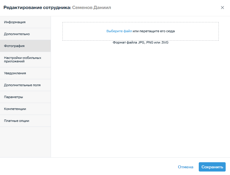 4. Во вкладке Фотография загрузите фотографию сотрудника. Поддерживаются форматы JPEG, PNG, GIF, максимальный размер загружаемого файла — 2 МБ.