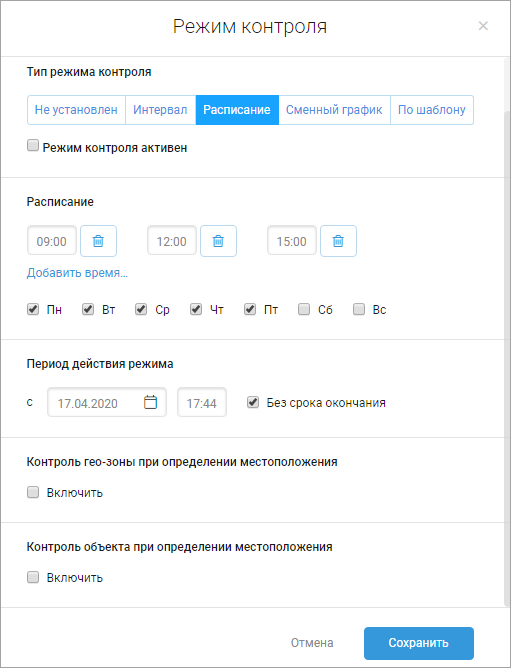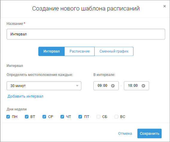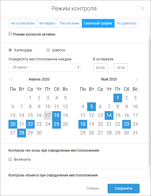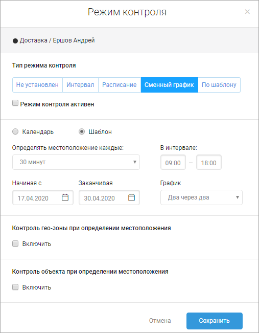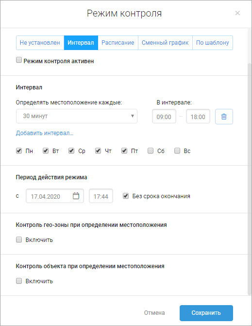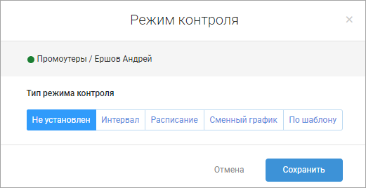 2. В открывшемся окне выберите режим контроля — интервал, расписание, сменный график или график по шаблону.