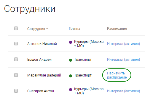 1. На вкладке Сотрудники выберите нужного сотрудника и нажмите ссылку Назначить расписание или на название режима.