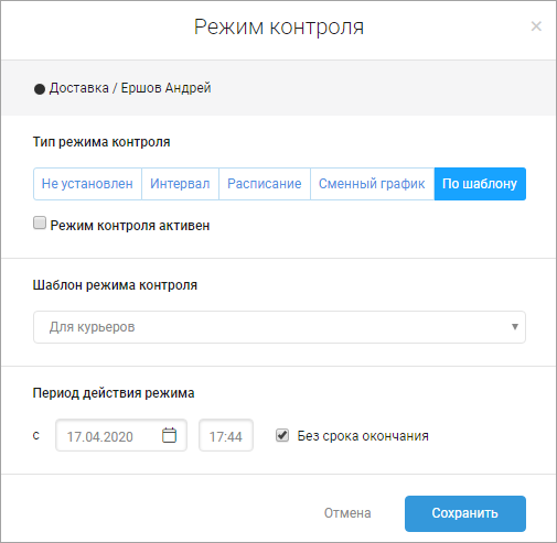 Здесь можно выбрать шаблон режима контроля и установить период действия режима.