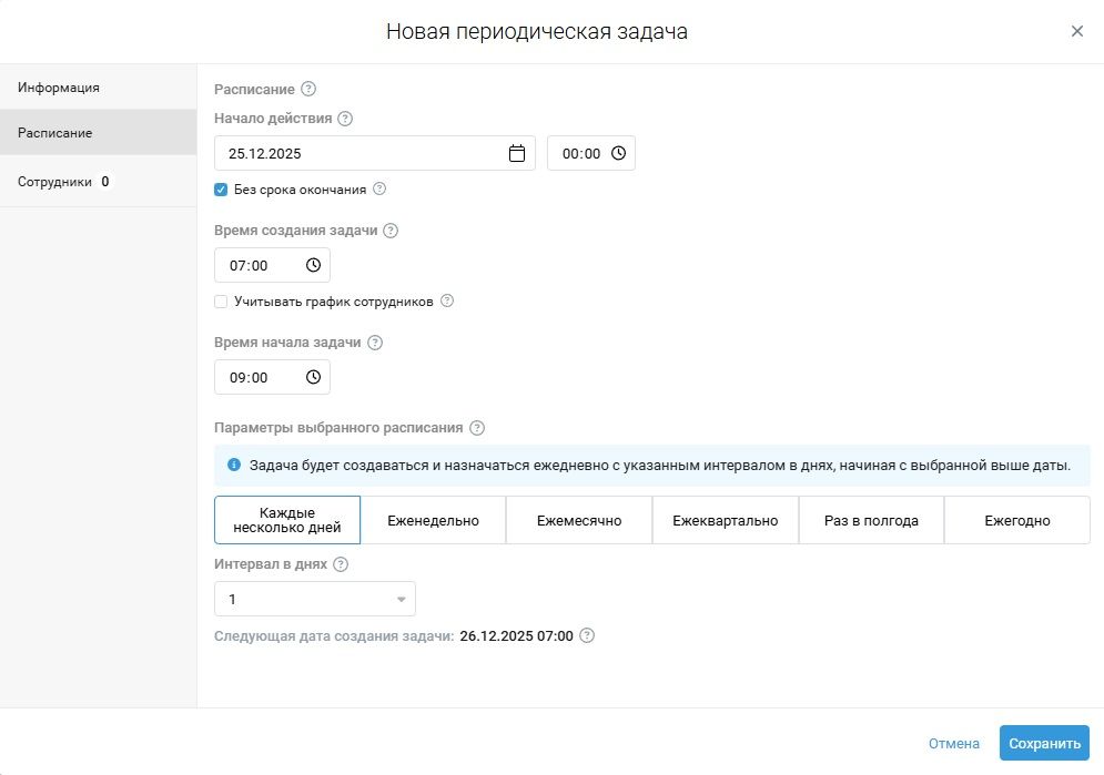 3. На вкладке Расписание выберите, с какого числа и времени задачи будут автоматически назначаться сотрудникам. Чтобы указать срок окончания расписания, снимите галочку Без срока окончания и выберите дату и время.