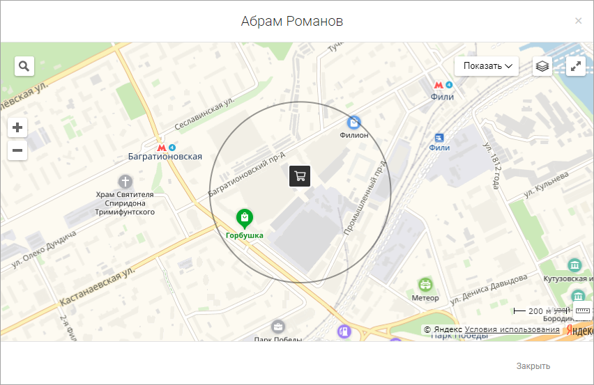 При нажатии на адрес в колонке Местоположение откроется дополнительное окно с картой, на которой отмечена точка пребывания сотрудника в момент запроса местоположения и отображается радиус погрешности местоположения.