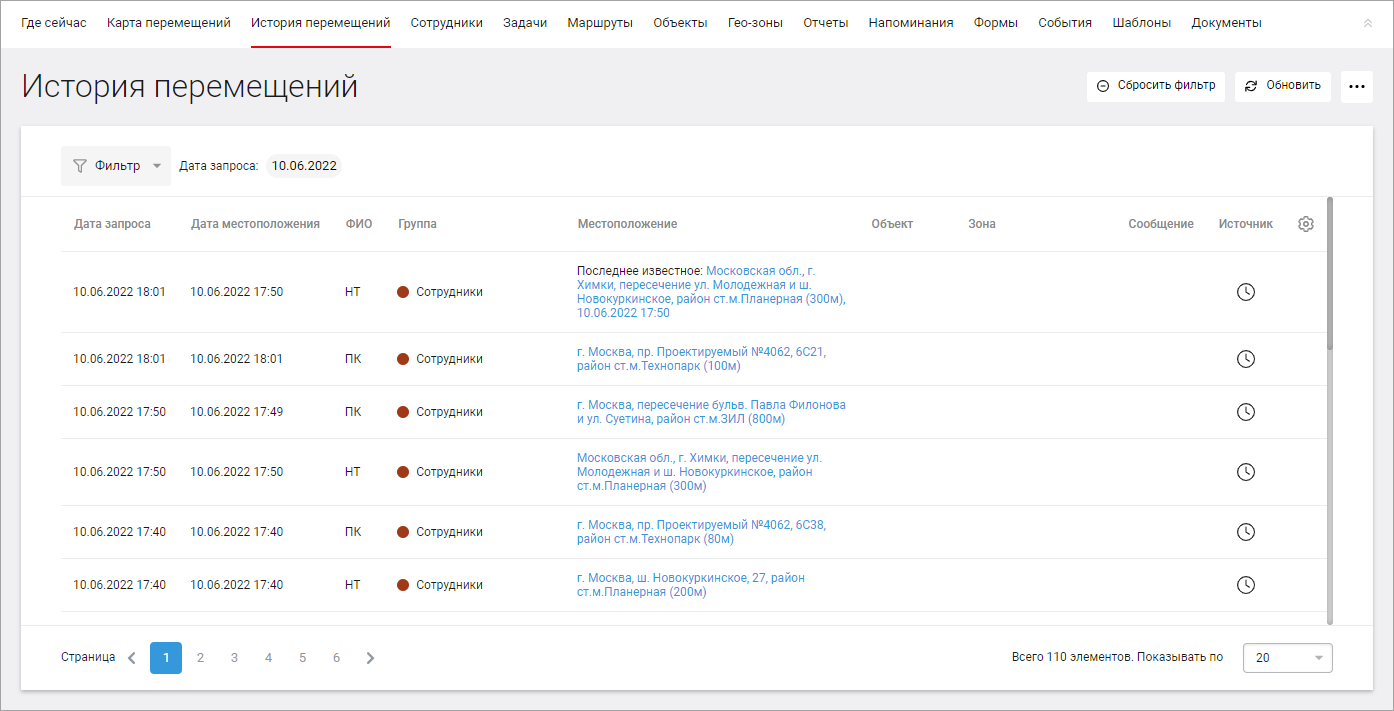 В разделе История перемещений приводится перечень всех запросов местоположений сотрудников. За нужный период вы можете посмотреть, где находились ваши сотрудники, в каких гео-зонах и объектах.