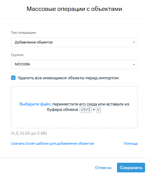 2. В открывшемся окне нажмите ссылку Скачать Excel-шаблон для импорта объектов.