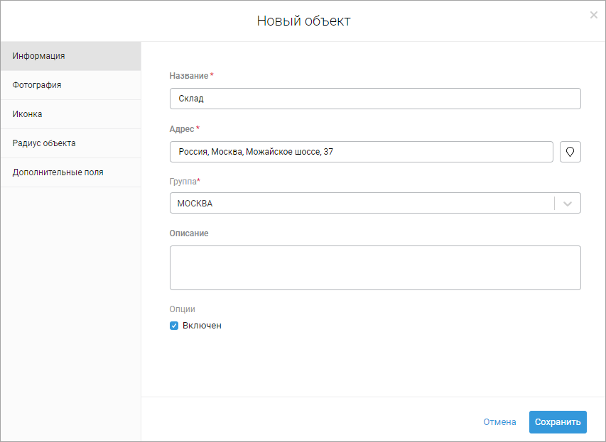 6. При необходимости снимите галочку опции Включен (активен или неактивен объект).