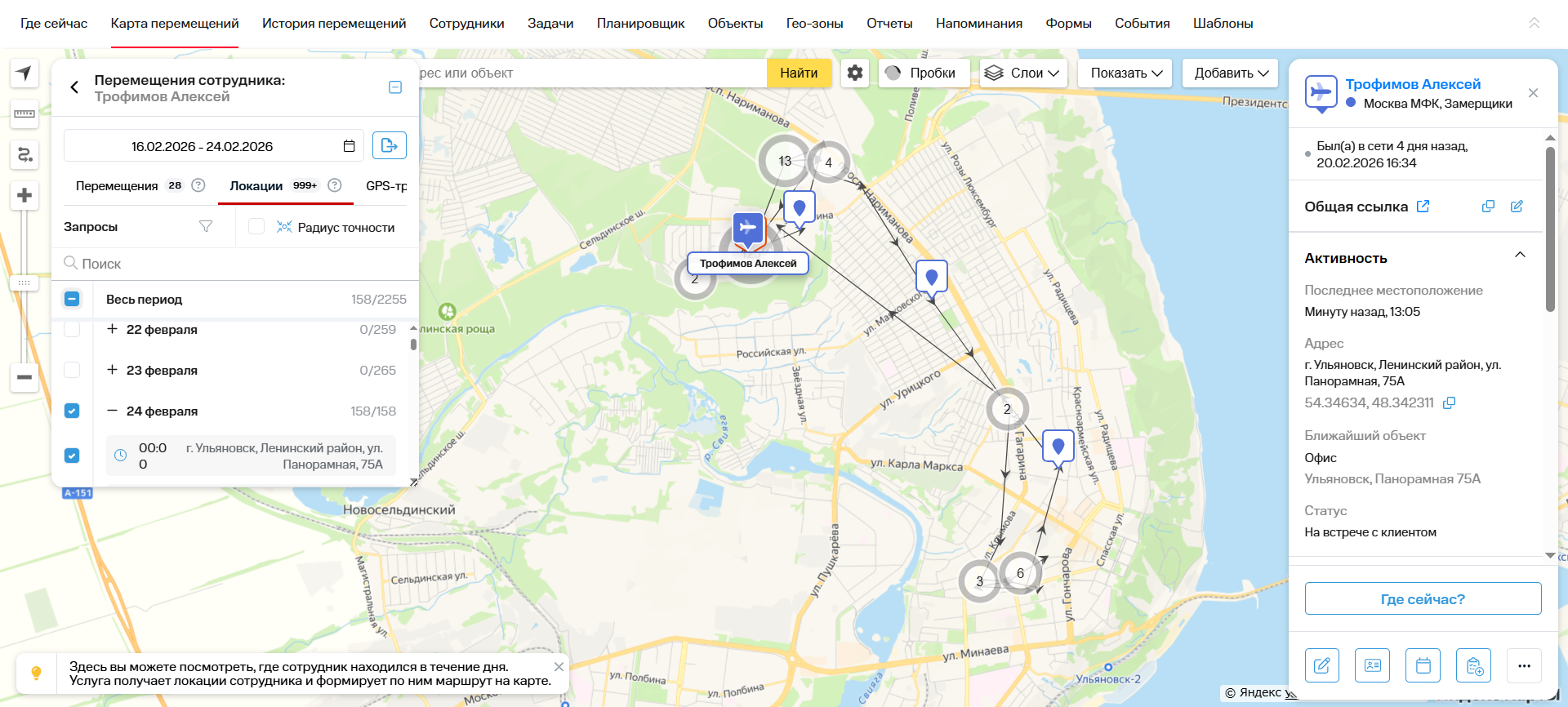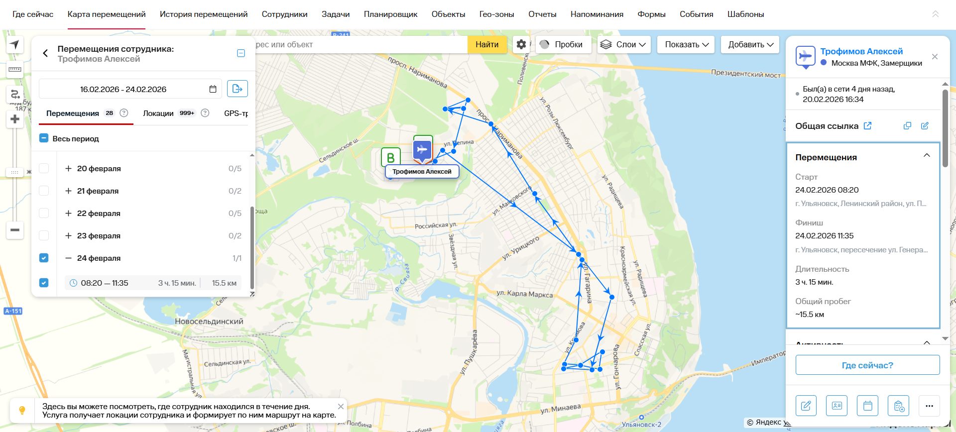На карте отображаются перемещения сотрудника, зафиксированные за указанный период.