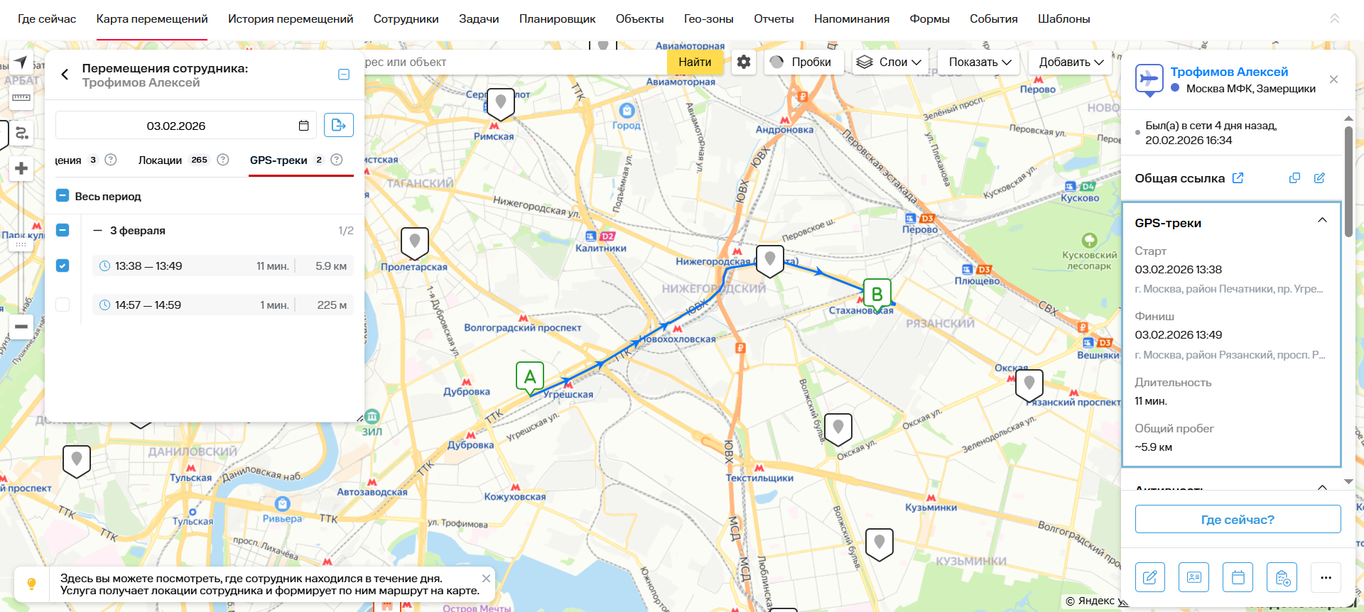 Подробности о перемещениях и GPS-треках отображаются в карточке сотрудника в правой части экрана.