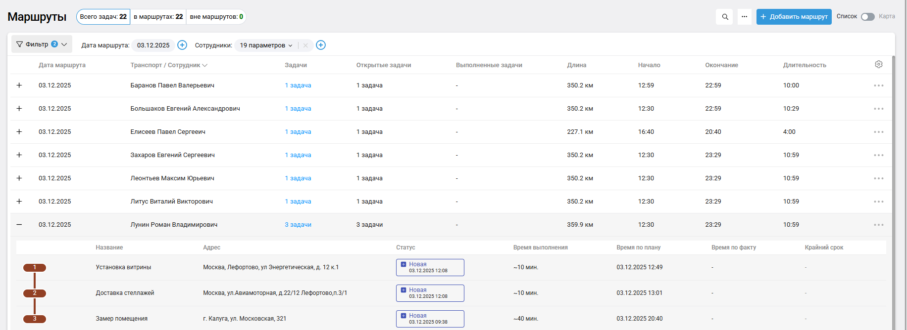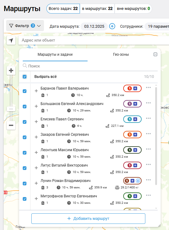 При просмотре маршрутов за текущий день в списке или на карте также отображаются задачи вне маршрутов.