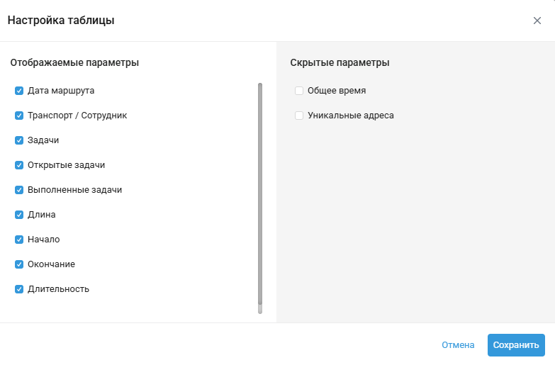 Чтобы выбрать, какие колонки должны отображаться в списке маршрутов, а какие нет: