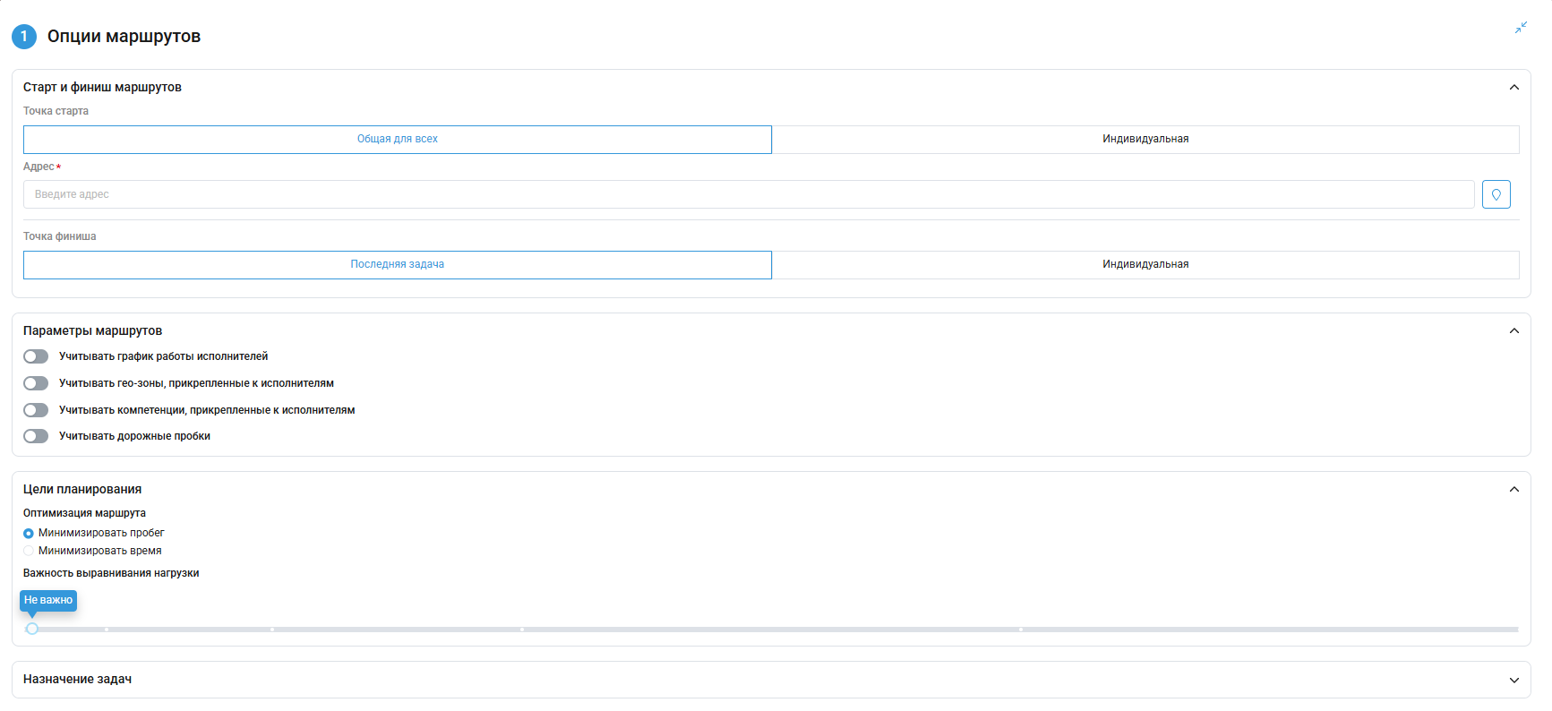 не задана — маршрут будет закончен по адресу последней задачи;