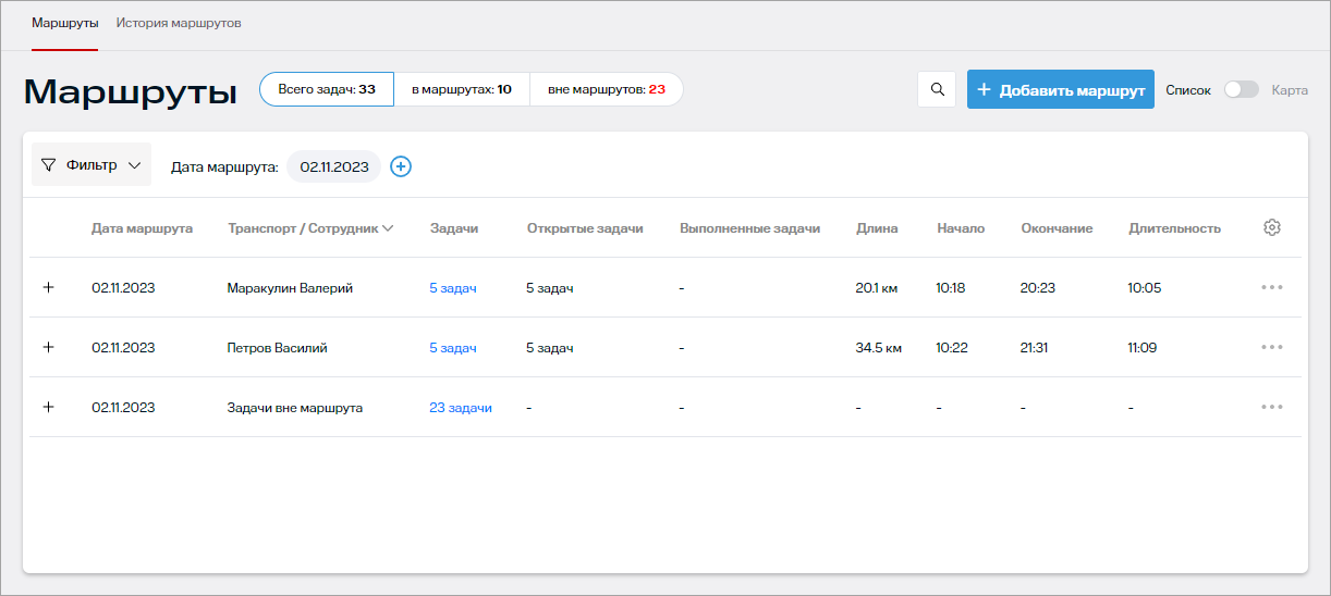 - параметры задач — в маршрутах, вне маршрутов. Отфильтровать задачи вне маршрутов можно только за текущий день.