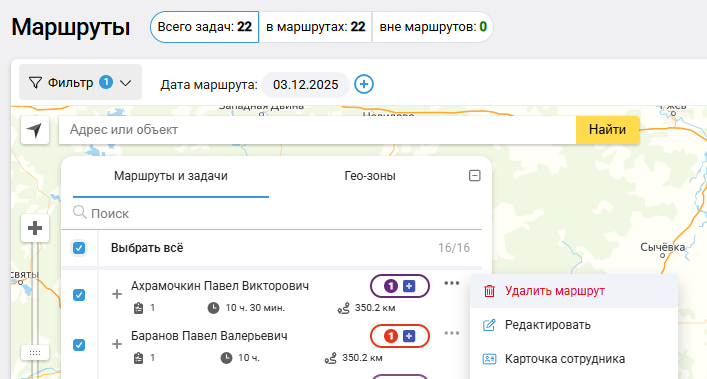 На карте отобразятся маршруты по сотрудникам.