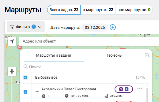 Этот виджет также можно использовать как фильтр: одним нажатием можно посмотреть все задачи, только задачи в маршрутах или только задачи вне маршрутов.