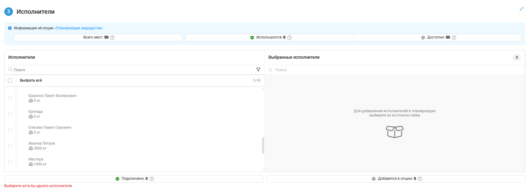 4. В шаге 3 «Исполнители» отметьте галочками сотрудников, для которых нужно построить маршруты.