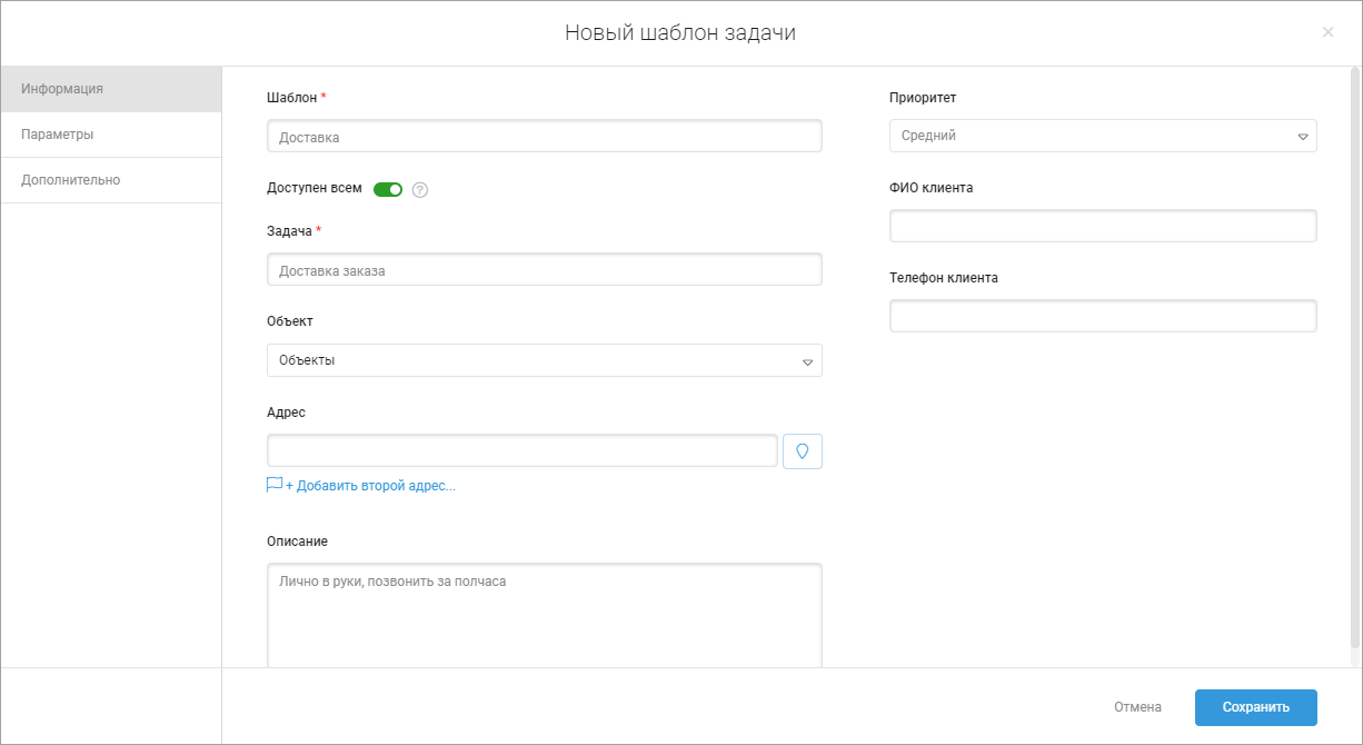 - Доступен всем — выключите переключатель, чтобы с шаблоном задачи могли работать только пользователи с ролью «Администратор».